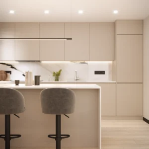 Przestrzeń pełna światła, w której jasne barwy i naturalne materiały tworzą harmonijne wnętrze.